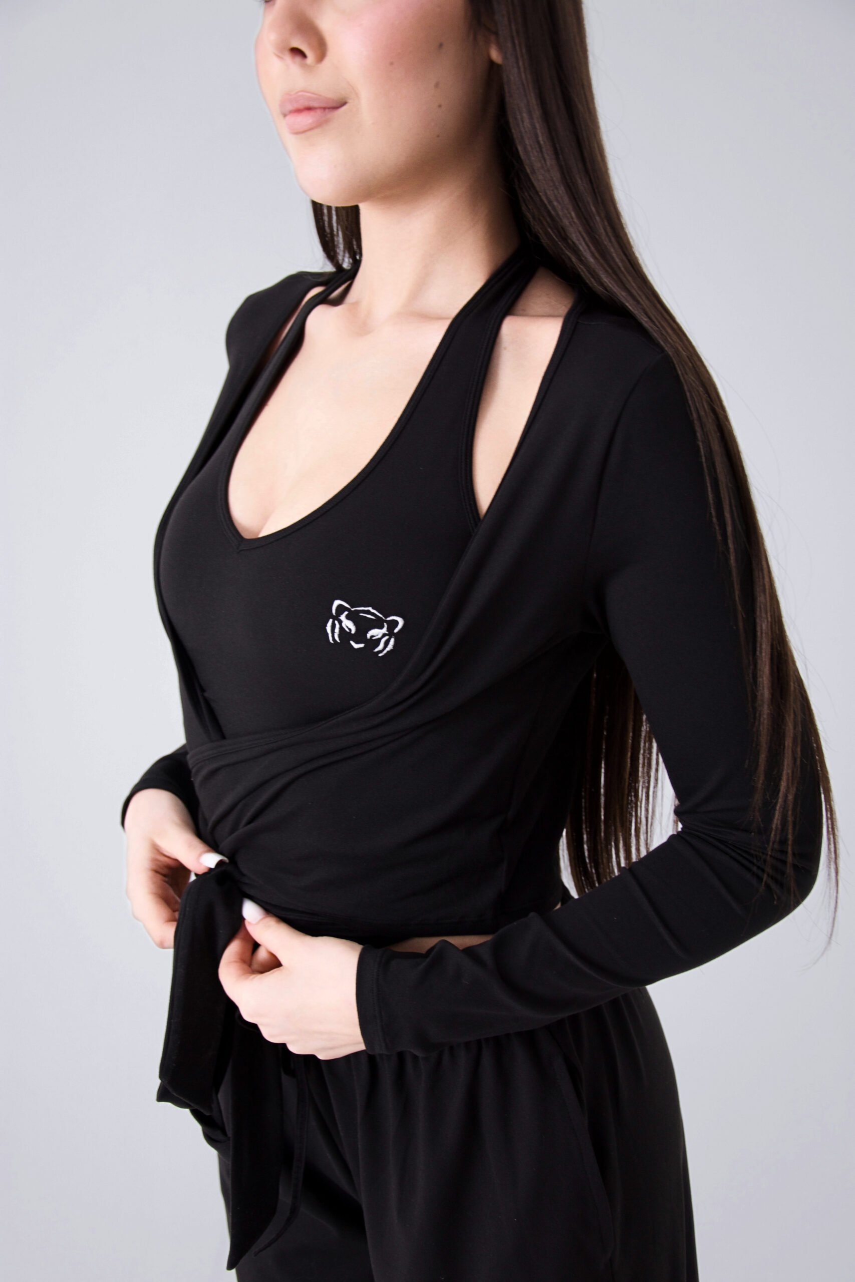 Dłuższy krój modeluje biust i brzuch, a odkryte plecy z tyłu dodają kobiecej lekkości i nowoczesnego charakteru. Miękki, elastyczny materiał otula ciało, zapewniając pełną swobodę ruchu.
